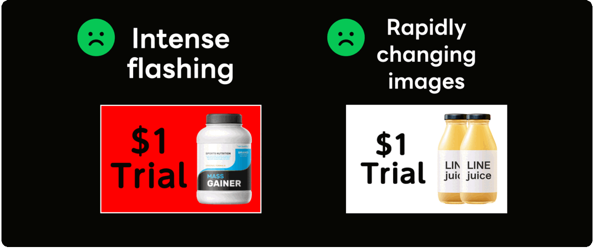 Ads with intense blinking and flashing elements and images that change rapidly are distracting for users and may obstruct from the media it's appearing in. For this reason, such creatives cannot be displayed. When including these design elements, put some effort into details such as adjusting the speed so that it doesn't feel too fast or intense, and having matching background coloring.
