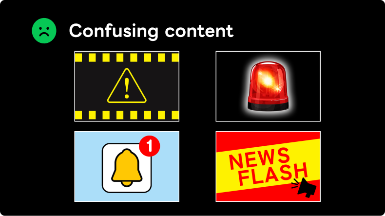 Designs resembling notification badges, alerts, and sirens as well as "News Flash" type text may induce users to abruptly tap the creative. For this reason, such creatives cannot be displayed. Content (not limited to the above) that may confuse users could be rejected upon review. Use full caution with designs that excessively draw users' attention.