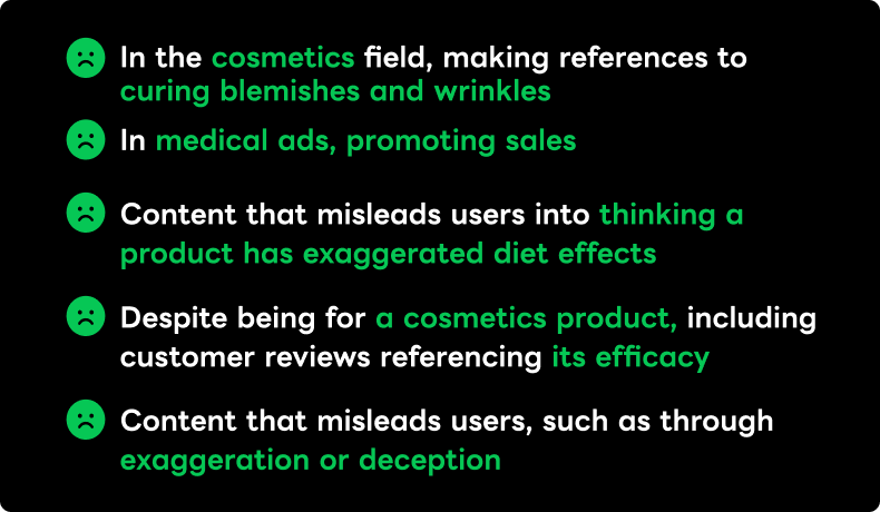 elow are a few examples of unacceptable content. The content varies by industry, so be sure to confirm the details beforehand, then make creatives that follow the rules.