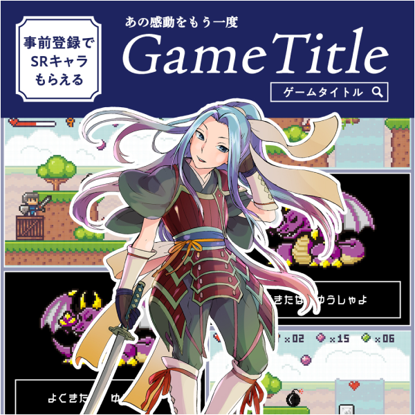 ファンタジー風の女性キャラクターが中央に描かれたゲームタイトルのビジュアル。背景にドット絵のゲーム画面が配置されている。