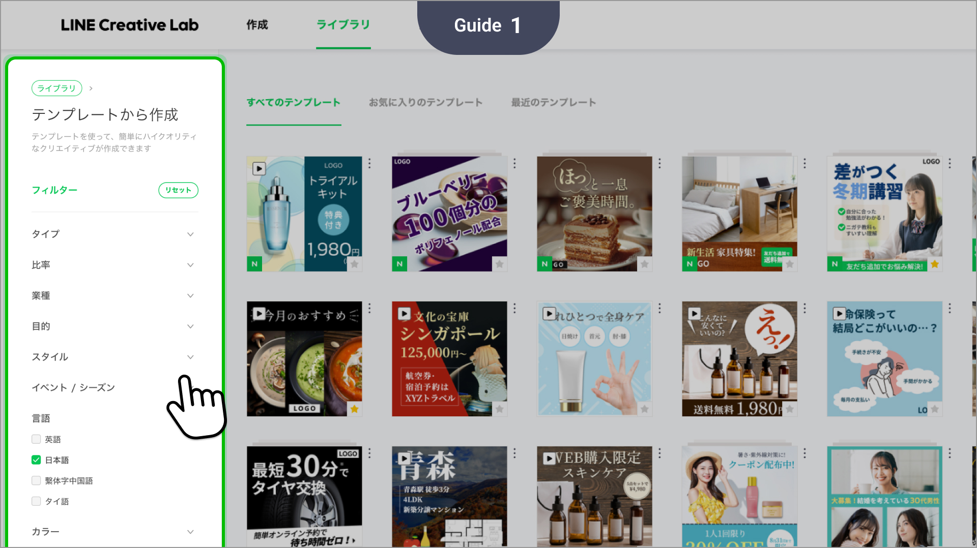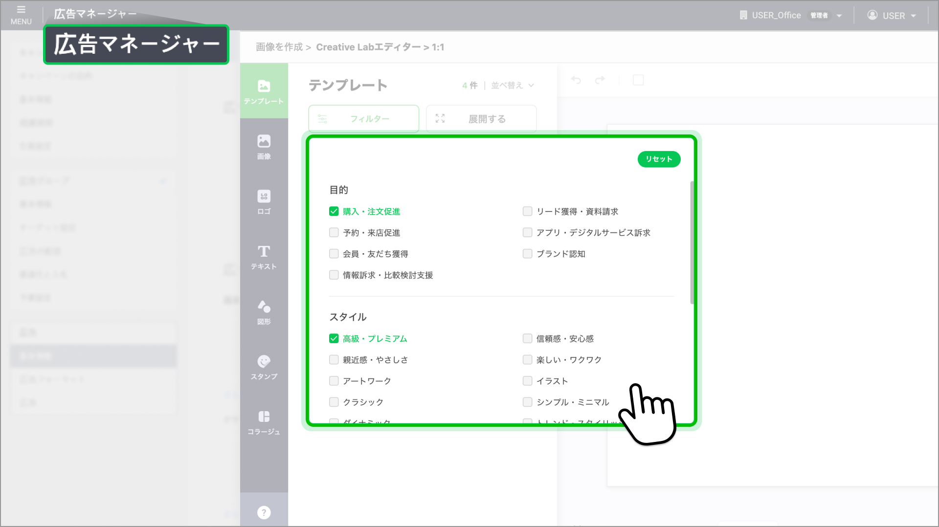 - テンプレート画面:より見やすいデザインになり、テンプレートのプレビューやフィルターを利用できます。 LINE広告の管理画面 : 広告作成画面:テンプレート選択時に新しい検索フィルターを利用できます。