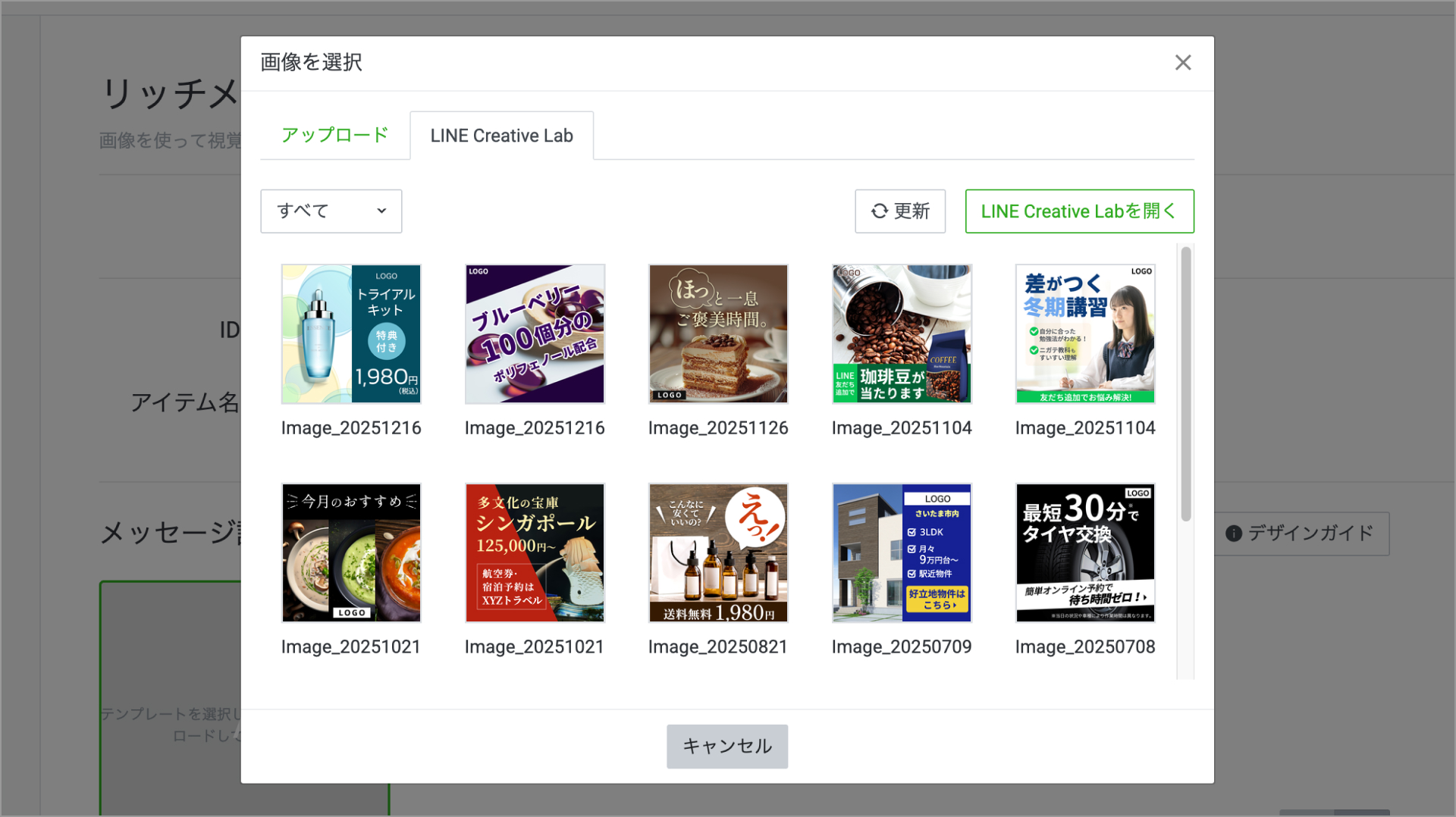 - LINE公式アカウントの管理画面 > リッチメッセージ > 画像を選択 > LINE Creative Labタブを参照 - LINE公式アカウントの管理画面で確認できるのはLINE公式アカウントの指定サイズのみとなります。指定サイズ以外はアラートのポップアップが表示され、管理画面では確認ができませんのでご注意ください。