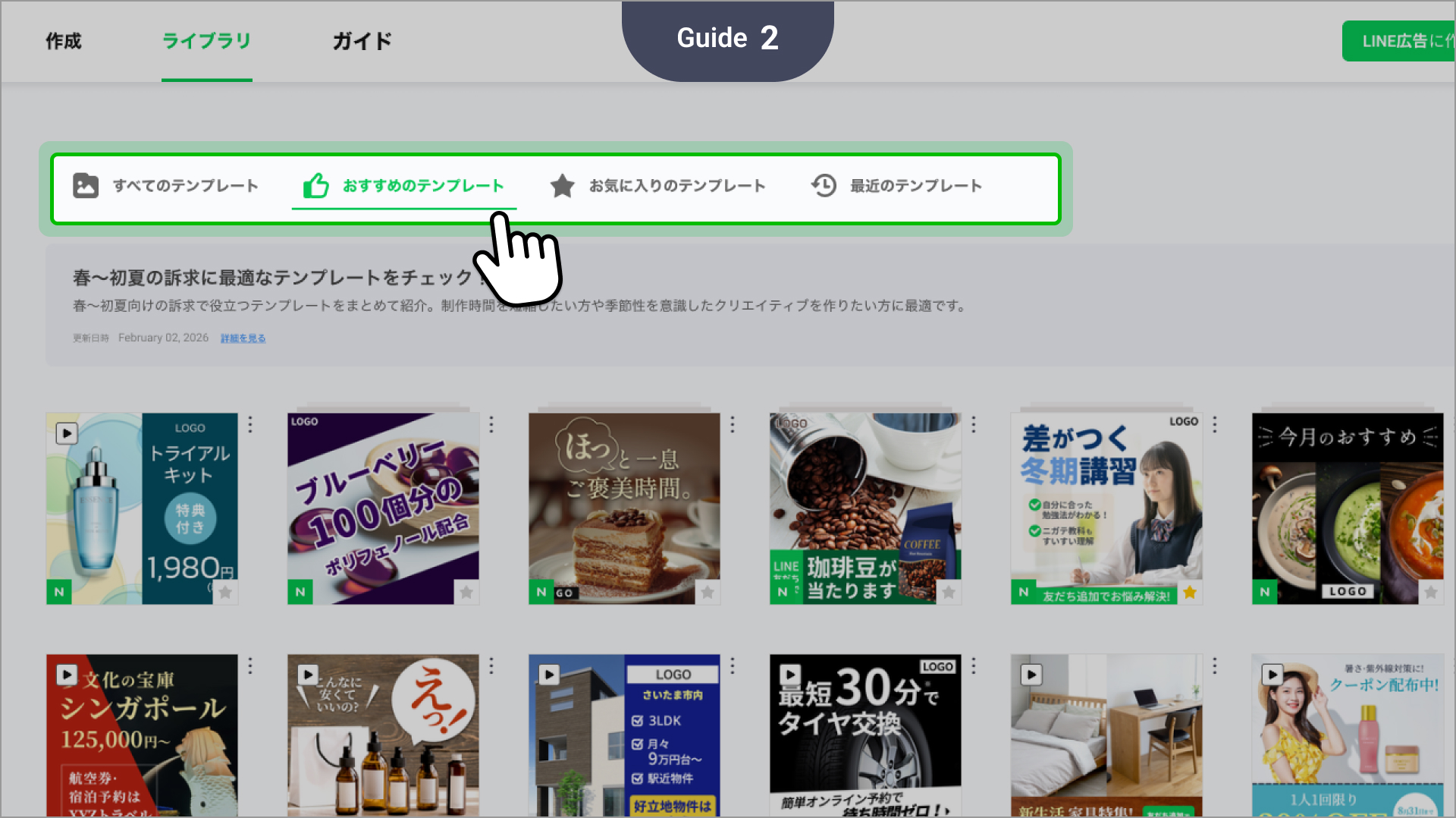 - 膨大なテンプレート一覧の中から、「今、使うべきテンプレート」を検索する時間を大幅に短縮。初めての方でも迷わずクオリティの高い広告を作成できます。 - 使い方