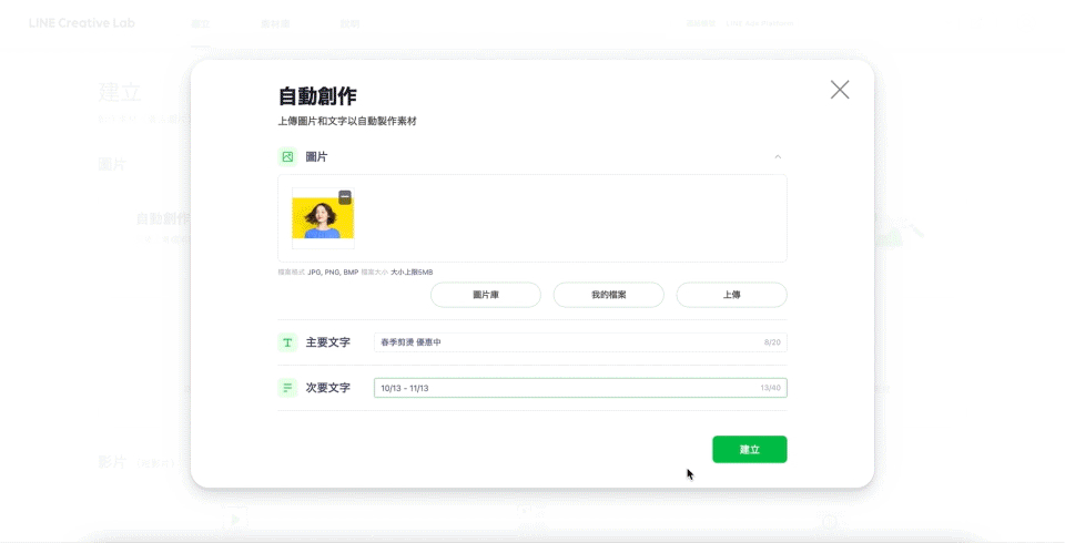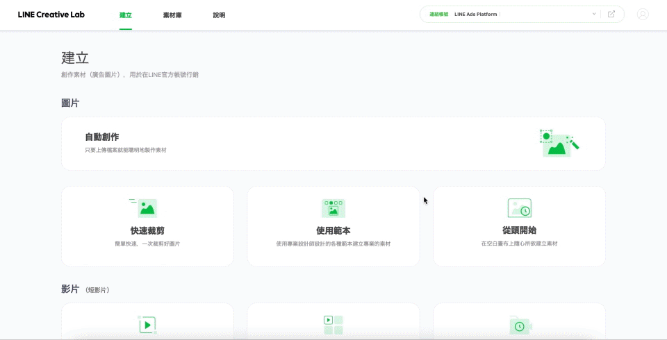 「自動創作」製作的素材,是基於LINE的廣告數據(例如:曝光量、點擊率),產出可能讓廣告成效更好的範本。 透過 「自動創作」 ,您也可以了解最新的LINE廣告設計趨勢。
