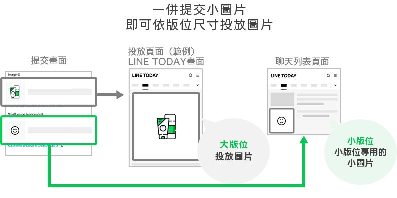 在提交廣告成品圖片時只要一併提交小版位用的圖片,系統將依據廣告版位的尺寸(大版位・小版位)為您投放適合該版位的圖片。