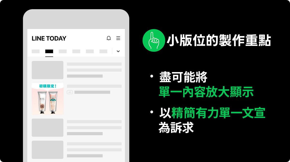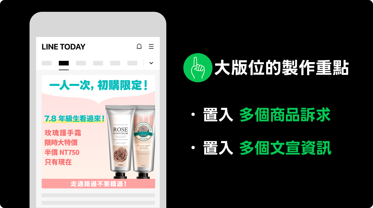 投放於LINE TODAY等大版位畫面時,由於版位大容易辨識細節,因此可在設計時置入較多的訴求。
