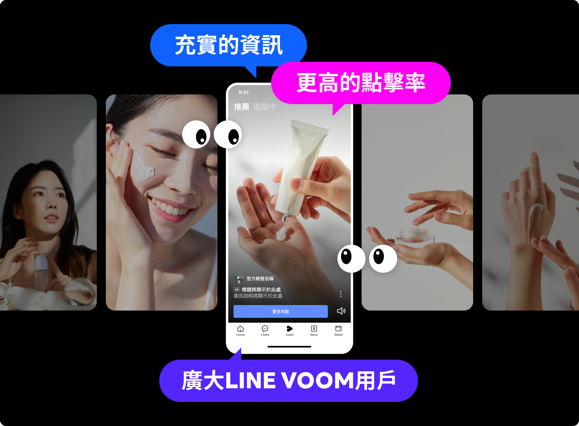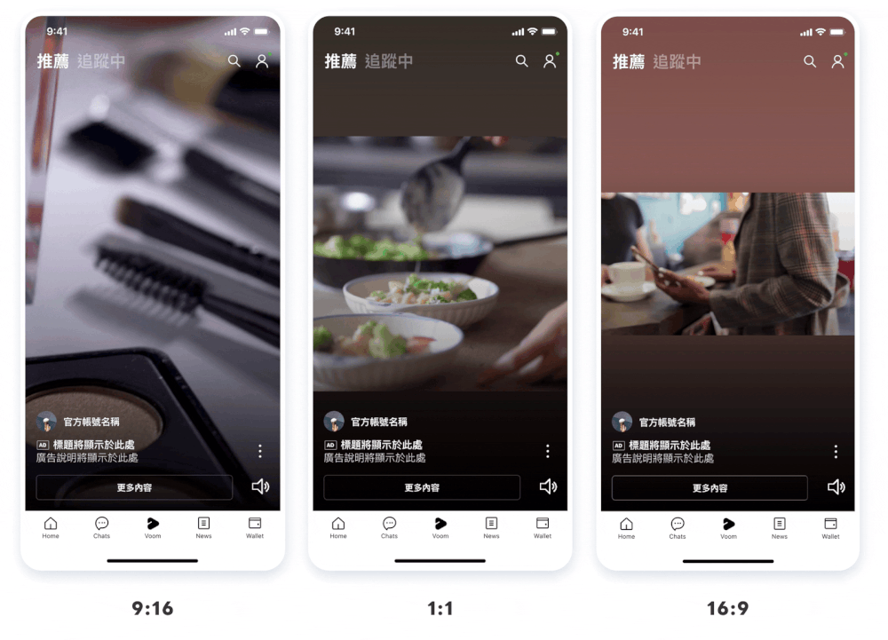 最適合手機螢幕的9:16直式影片廣告僅於LINE VOOM內提供。